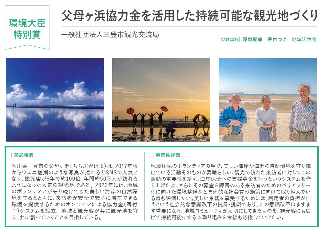 香川県三豊市の父母ヶ浜(ちちぶがはま)の地域の人々が守り続けてきた美しい海岸を守るとともに、来訪者が安全で安心に滞在できる環境を提供するための父母ヶ浜協力金の取り組みが、ソーシャルプロダクツアワード2024(主催:一般社団法人 ソーシャルプロダクツ普及推進協会)「環境大臣特別賞」を受賞しました。