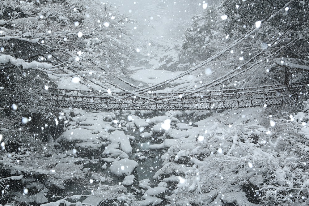 蔓橋被樹木四面環繞,由橋上俯瞰祖谷川的潺潺溪流。春季紫藤花開,夏天的新綠,秋季的紅葉,以及冬天的白雪。無論您何時前來,都能沉浸在四季幻變的美麗景致中。