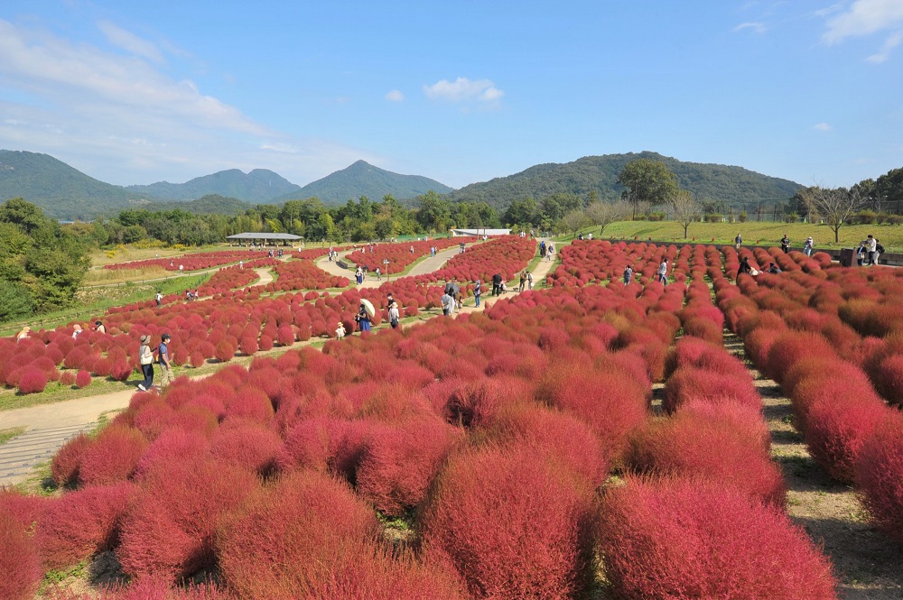 地膚 (コキア) 是一種橢圓形,蓬鬆的植物,布滿山丘。夏天整片綠葉,秋天則轉為赤紅,賞心悅目。