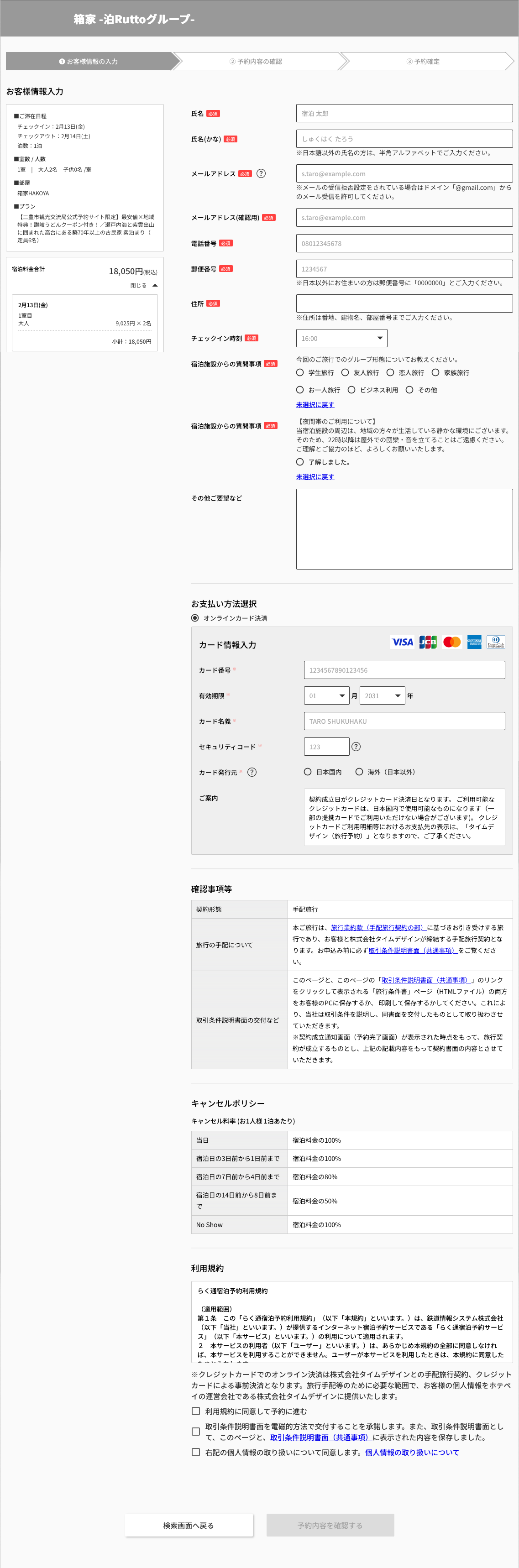 點選「予約内容を確認する(確認預約內容)」後即進入第二步驟:「②予約内容の確認」,再次確認填寫的資料後,即可進入「③予約確定」完成您的訂房預約。