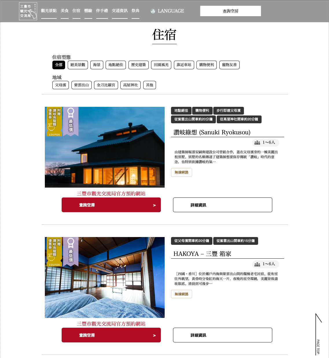🌐 ️三豐市觀光交流局官方訂房網站(旅宿中文介紹、訂房介面目前為日文): 官方訂房網站