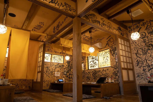 Handwritten messages cover every wall around the table seating