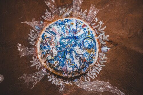 Vayeda's piece, titled "Cave Mural as Narrating the Story of Where We Came From," uses traditional Warli Art to tell the story of humanity's origins and progression. "The Story of a Whale Being Reborn as Oxygen" by Ohkojima focuses on the cycle of life and transformative rebirth through the death of a whale.