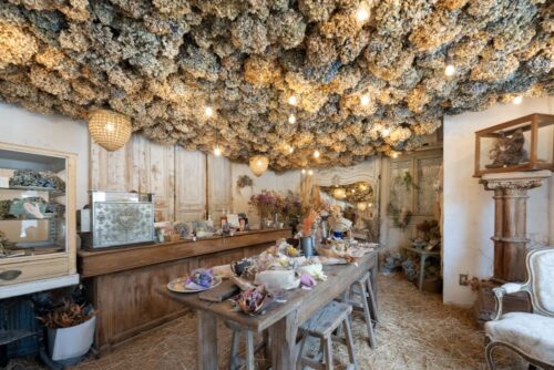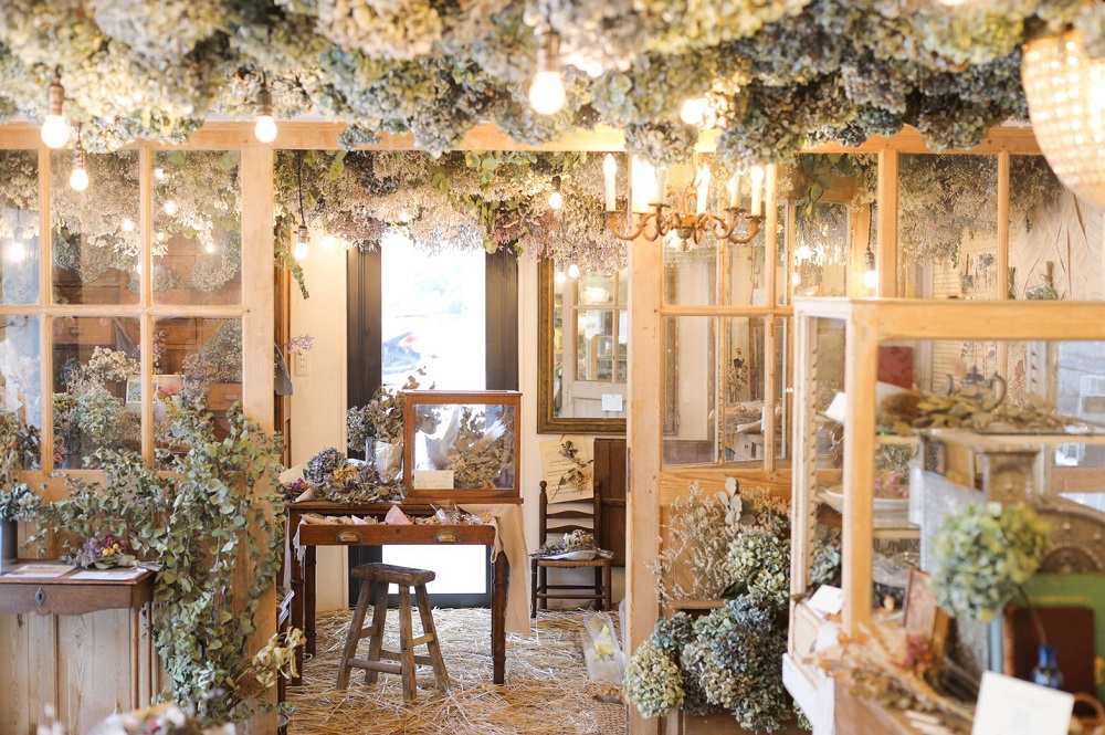 A Botanical World! A café stand filled with hydrangea dried flowers.