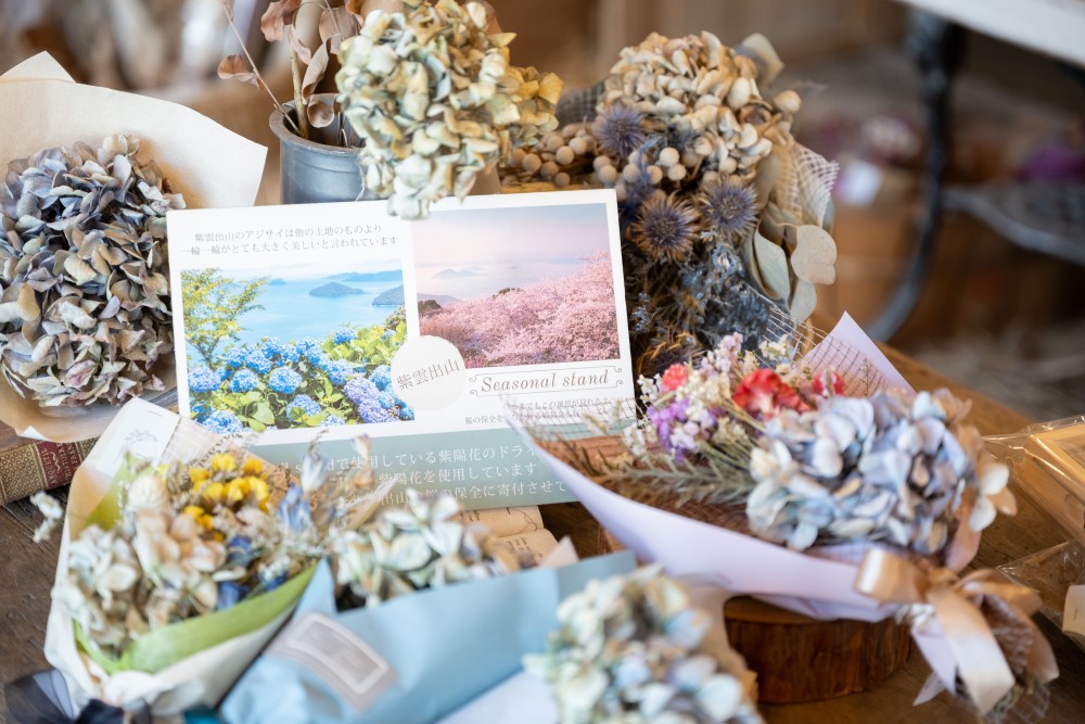 In the Mt. Shiude Room, dried hydrangeas from Mt. Shiude (known as a popular spot for cherry blossoms) are sold. Part of the proceeds from sales of these dried flowers is used for the preservation of Mt. Shiude's cherry trees.