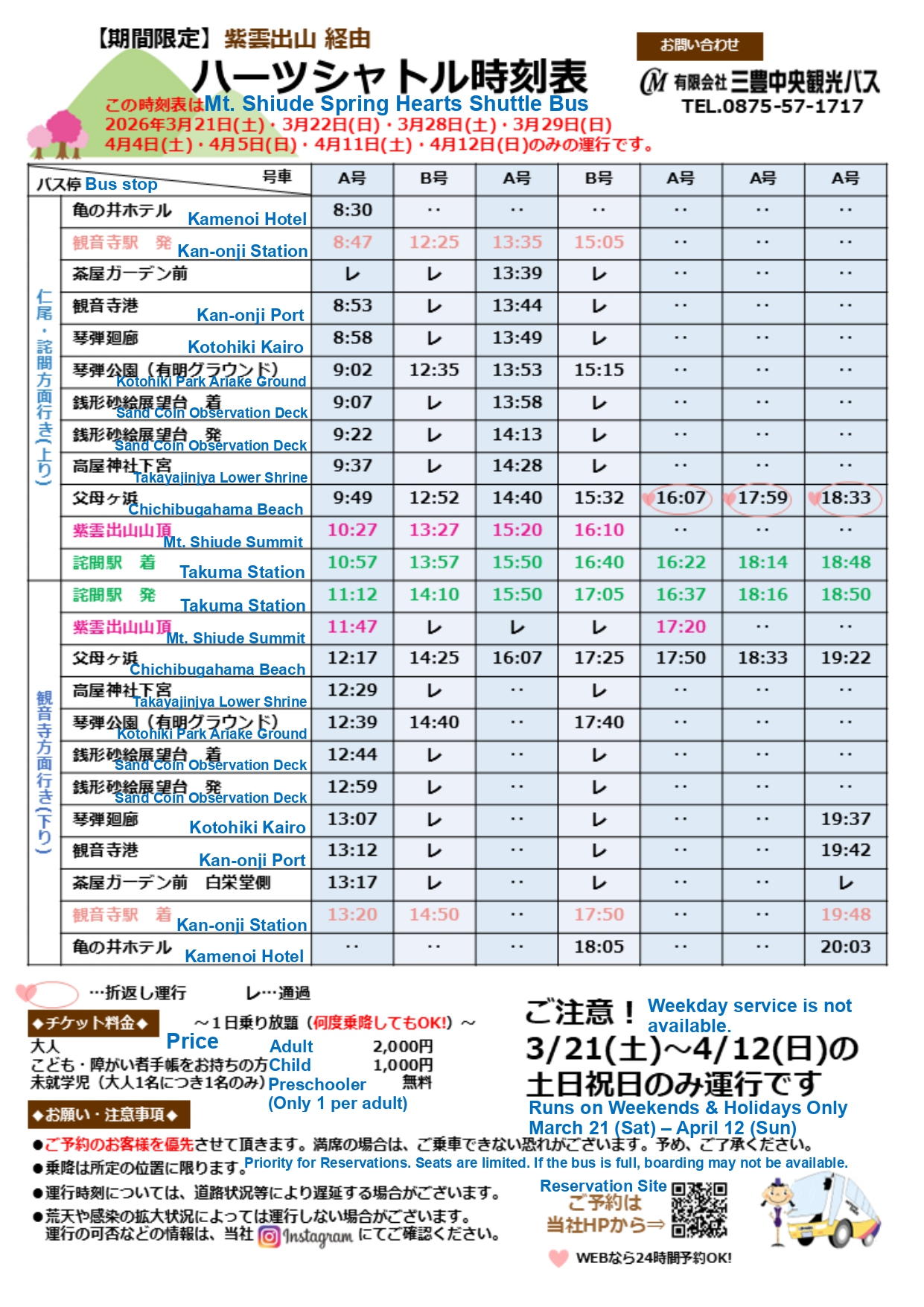 If you are concerned about the status of your reservation(s), please e-mail Mitoyo Chuo Kanko Bus at the email address at the bottom of this page.