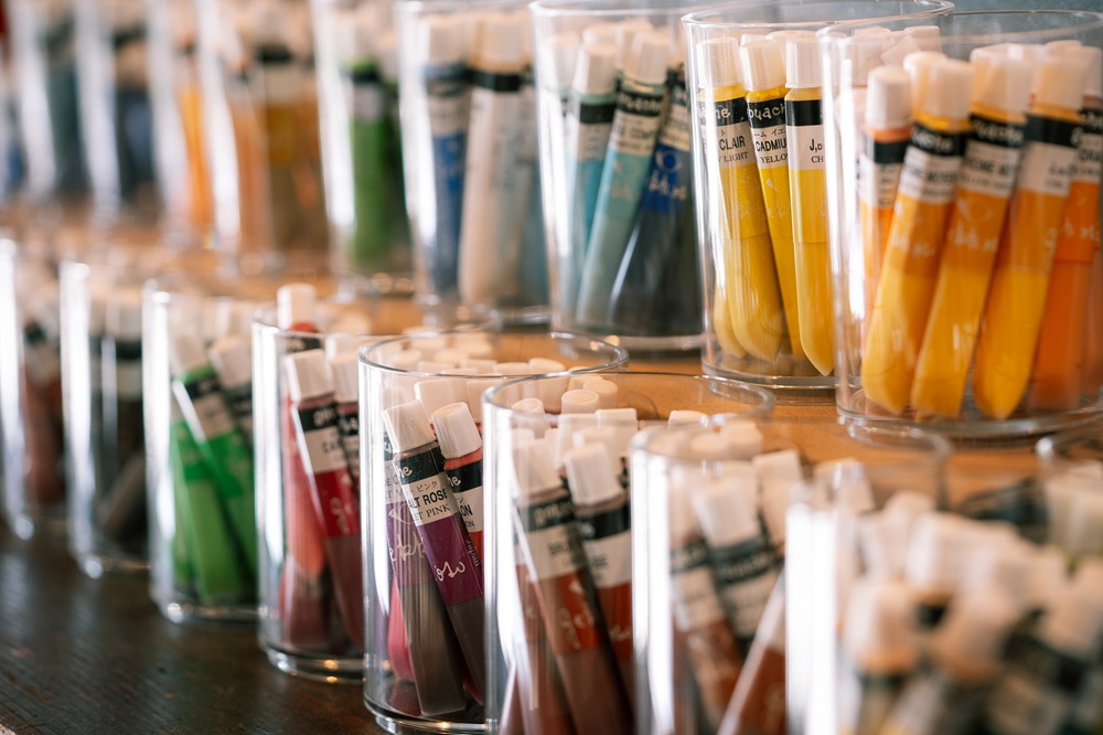 自由に使える画材や絵の具を設置しており、Tシャツやお皿、タイルなどにその場で絵を描いて持ち帰ることも可能。