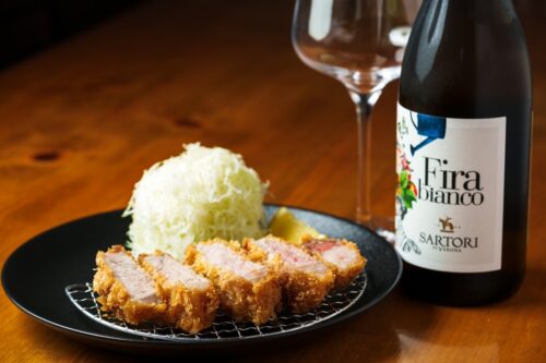 生パン粉で揚げた外サクサクの衣&さっぱりした脂の甘みは絶品。まずはそのまま、次にレモン&塩、最後は自家製ソースで味変を楽しんでいただきたい。